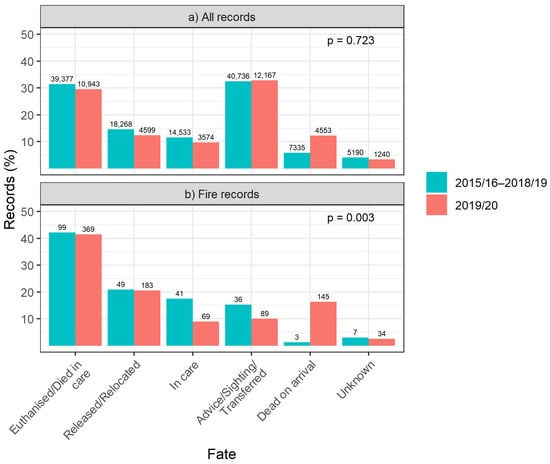 Fate as a proportion (%) of (a) all marsupial records and (b) fire-affected marsupial records in 2015/16–2018/19 (blue columns) and 2019/20 (red columns). Record counts (n) are presented above columns. The fate of “In care” indicates that the animal was still in care at the time of reporting, and the fate of “Dead on arrival” indicates that the animal died between the time it was reported and when a rescuer arrived.