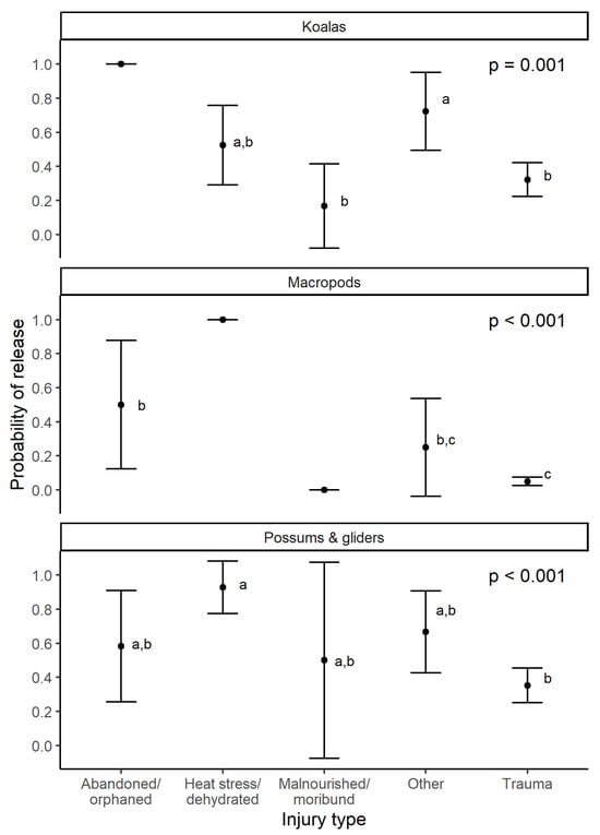 Mean ± 95% CI probability of release (0 = euthanised/died in care, 1 = released/relocated) of fire-affected marsupials in 2019/20 for koalas, macropods, and possums and gliders, by injury type. Superscript letters indicate injury types for each marsupial group that are significantly different based on pairwise comparisons.