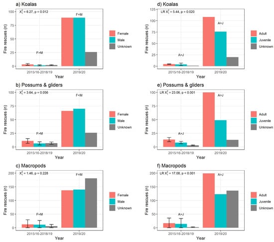 Number of fire-affected marsupial rescue records in 2015/16–2018/19 and 2019/20 for koalas, possums and macropods by sex (a, b and c, respectively) and by age (d, e and f, respectively). The data for the period 2015/16–2018/19 are presented as yearly mean ± SD, while the data for the year 2019/20 are absolute numbers. LR chi-squared analyses are testing for an overall difference in proportions of ages (where no change occurred between years), and chi-squared analyses are testing for a change in relative proportions of sexes between years.
