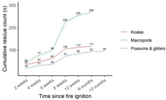 Cumulative number of koalas, macropods, and possums rescued due to fires in 2019/20 (n = 480 with accurate dates of rescue and fire ignition, excluding those found dead) over 12 months following ignition of the fire at the relevant rescue location. Cumulative n values are presented above each line.