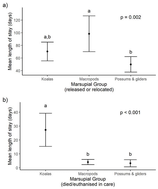 Mean ± 95% CI length of stay (days) of fire-affected koalas, macropods, and possums and gliders that were (a) released or relocated (n = 183) and (b) died or euthanised in rehabilitation after rescue (n = 369) in 2019/20. Note the different scales on the y-axis between figure (a,b). Marsupial groups with significantly different lengths of stay are denoted with different superscript letters (a or b) at p ≤ 0.001.