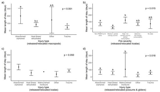 Mean ± 95% CI length of stay (days) relative to significant predictor variables for fire-affected marsupial groups released/relocated in 2019/20: (a) macropods by injury type, (b) koalas by fire severity, (c) koalas by injury type, and (d) possums and gliders by injury type that were. Note: The 95% CI for koala injury type malnourished/moribund was wide [−763 and 902] and is not displayed. Superscript letters denote significant differences between categorical variables as determined using pairwise comparisons.