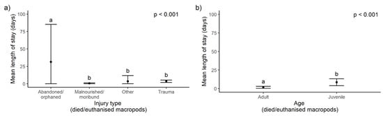 Length of stay (days) for fire-affected macropods and koalas that died or were euthanised in rehabilitation after rescue in 2019/20 relative to the significant predictor variables outlined in Table 3. Macropod mean (±95% CI) length of stay (days) versus (a) injury type and (b) age. Superscript letters denote significant differences between categorical variables as determined using pairwise comparisons.