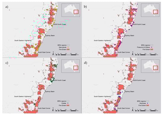Most fire-affected macropod (Figure 9a) and possum (Figure 9b) reports in 2019/20 occurred in four NSW IBRAs: NSW North Coast, South East Corner, South Eastern Highlands and the Sydney Basin (Figure 10). Koalas were reported mostly in the NSW North Coast and South Eastern Highlands IBRAs (Figure 9c and Figure 10) and are discussed in detail in the work of Lunney et al. []. Wombats were reported in the South East Corner (n = 12), South Eastern Highlands (n = 14) and Sydney Basin (n = 16; Figure 9d). The dasyurids, bandicoots, bettongs and potoroos were all rescued in the NSW North Coast (n = 20).