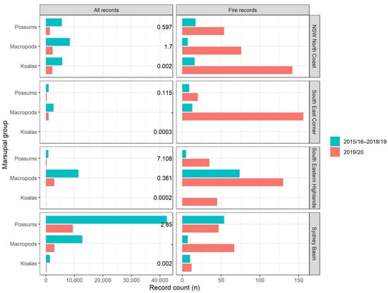 Number of records for possums, macropods and koalas in each of four main IBRA regions (NSW North Coast, South East Corner, South Eastern Highlands, Sydney Basin) with any cause for rescue (all records) and fire-affected animals (fire records) across the years preceding the 2019–2020 bushfires in eastern Australia (2015/16–2018/19; blue columns) and the year of the 2019–2020 bushfires (2019/20; red columns). Density estimates for possums, macropods and koalas are annotated down the centre of the chart (per ha); macropod and possum densities were extracted from van Eeden et al. []; koala densities were calculated as mean population size from Adams-Hosking et al. [] over IBRA size (ha) from DAWE [].