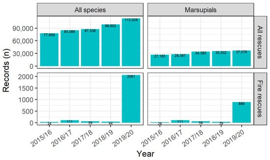 Wildlife rescue and rehabilitation are increasingly recognised as important components of emergency disaster responses [,]. While we have estimates of the number of native animals killed or displaced during the 2019/20 fires [], published accounts of the magnitude and outcomes of bushfire-associated rescue and rehabilitation have been scant, except for recent estimates for the number of koalas rescued in New South Wales (NSW) [] and triage assessment findings for fire-affected koalas on Kangaroo Island []. Lunney et al. [] found that 209 koalas were rescued in NSW, but we do not know how their rescue rates compare with other species, or their magnitude relative to their pre-existing population densities.