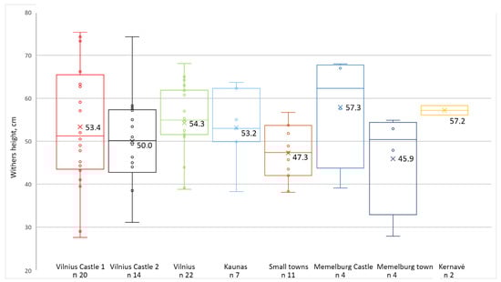 Withers height of dogs in the sites studied. Vilnius Castle 1—Vilnius Lower Castle 13th–15th C AD; Vilnius Castle 2—Vilnius Lower Castle 16th–17th C AD; Vilnius and Kaunas towns—16th–18th C AD; Memelburg Castle—recent Klaipėda Castle late 13th–16th C AD; Memelburg town—recent Klaipėda town 16th–18th C AD; Kernavė medieval town and hillfort 13th–14th C AD. For sites, their location, and more detailed biometrical data of the dogs, see Figure 1, Table 2 and Table S1. Numbers indicate the average height of the animal; the line indicates the median [].
