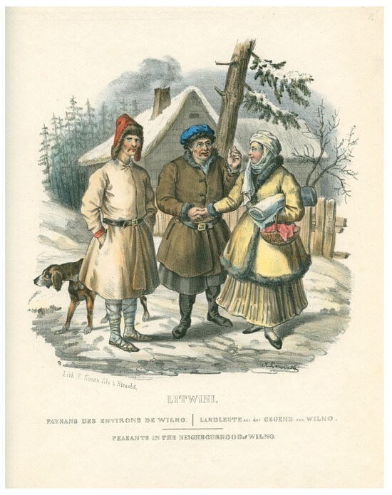 A dog similar to a large local hound (ogar), described in the literature and historical records of the 19th C AD, together with Lithuanian peasants in the Vilnius surroundings, 1841, LNM, IMik 4367.