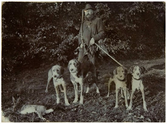 The main criteria for selecting dogs in Lithuania and nearby countries in the 19th C AD were their working abilities. There is no doubt that the same patterns existed in earlier centuries. As historical data have revealed, previously popular large dogs, e.g., large sighthounds and robust Molossian-type hounds, were almost completely extinct in Lithuania by the end of the 19th C AD, with some Molossian-type canines having been extinct even earlier. The main reason for the loss of large dogs was the near extinction of large game in the 19th C AD. Instead, small game and birds were hunted, and thus large canines were simply no longer needed. In addition, in the 19th C AD, new breeds of hunting dogs, such as setters and spaniels, were being bred in western Europe, and had arrived in the Baltic region. These new dogs had excellent characteristics and were very suitable for hunting small game, thus becoming very popular in the Baltic region, as well as in Poland. These two reasons were perhaps the most important reasons for the extinction of a number of old native dog breeds in the 19th C AD, which had previously been bred in areas like present-day Lithuania, as well as Latvia and Poland. These included the large native Lithuanian hound ogar (Figure 3), the Curonian hound, and the Curonian pointer, as well as Curonian sighthounds and several other types of hunting dogs [,,,].