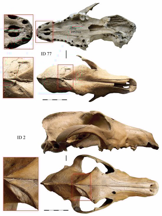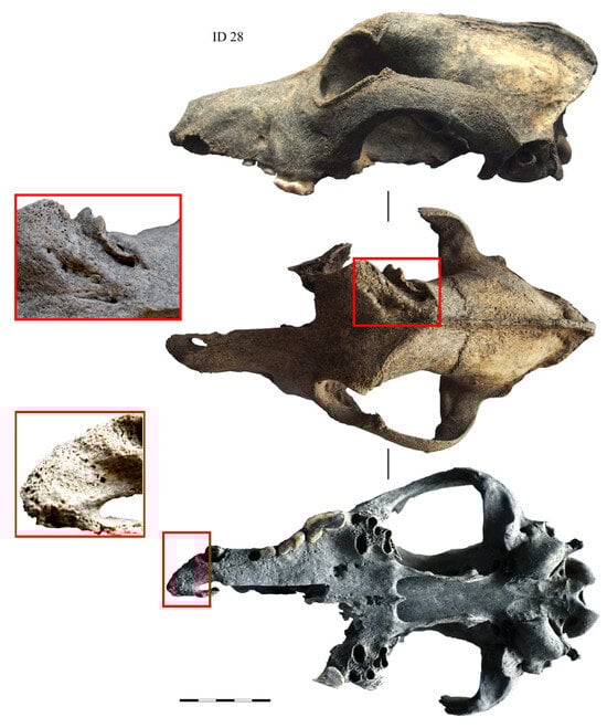 The difference in the health, care, and diet of the urban and elite dogs was most evident in their dental and overall oral health conditions. The urban canines often suffered from dental and jaw problems such as severe tooth wear, tooth loss, and periodontal disease (Figure 5). In small and large towns, a third of the dogs suffered from the aforementioned oral health problems, while in castles, the number of animals suffering from such problems was half as high—approximately 14% of the individuals [,]. The higher frequency of oral pathologies in the urban dogs is most likely due to their high malnutrition and regular consumption of hard food (bones) []. In contrast, the dental and overall oral health of the castle canines were very good. This is likely due to the presence of good, specially prepared food, and the general good care of the expensive elite dogs. Meanwhile, skull injuries affected both the city and castle dogs. A similar number of healed skull traumas, mainly impact fractures of the frontal bone and maxilla (Figure 5 and Figure 6), were found in the urban and castle canines in Vilnius, with 24% and 22% of individuals, respectively [,].