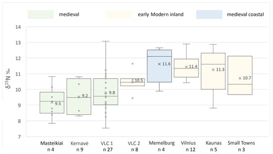 Distribution of the δ15N values of dogs from different sites and periods. Site explanations: VLC 1—Vilnius Lower Castle 13th–15th C AD; VLC 2—Vilnius Lower Castle 16th–17th C AD; Memelburg Castle—recent Klaipėda, late 13th–early 14th C AD; Kernavė—Kernavė medieval town and Aukuras hill hillfort, 13th–14th C AD. Numbers indicate the average value of stable isotope ratios; the line indicates median. For sites and their location, see Figure 1.