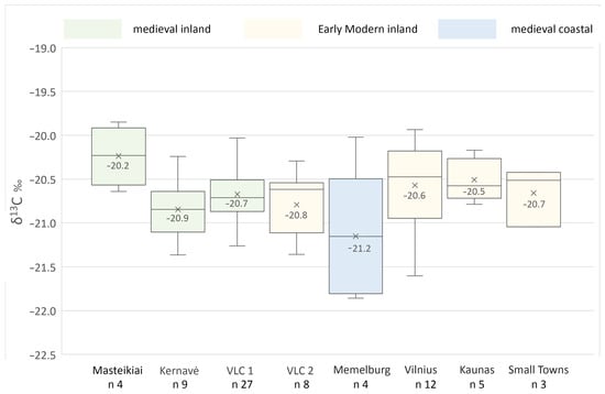 The dogs’ overall carbon stable isotopic values ranged from −21.9‰ to −19.9‰, and the average value was −20.7 ± 0.4‰ (Table 2 and Table 3, Figure 8 and Figure 9). The highest δ13C values were measured in the Masteikiai canines’ bone collagen samples (avg. −20.2 ± 0.3‰), while in Klaipėda/Memelburg Castle, these were the lowest (avg. −21.2 ± 0.7‰). However, the statistical analysis of the carbon stable isotope ratios did not show significant differences between sites (Kruskal–Wallis rank sum test, p > 0.05). The slightly higher carbon values of the Masteikiai dogs may reflect the presence of millet in their diet. In medieval Lithuania, millet was still cultivated in some areas, although only to a small extent [].