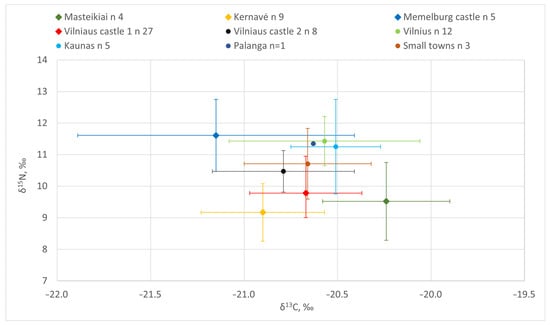 The lowest δ15N values were measured for dogs from all of the medieval inland sites—Masteikiai (avg. 9.5‰), Kernavė (avg. 9.2‰), and 13th–15th C AD Vilnius Lower Castle (avg. 9.8‰) (Table 3, Figure 7, Figure 8 and Figure 9). The nitrogen stable isotope values of the canines found in these medieval sites were significantly different from those of the early modern period dogs (p < 0.05). In general, such nitrogen values are typical for omnivores, as plant food was the main contributor to their diet, with the occasional addition of meat [,,,]. The highest mean δ15N values were recorded in dog samples from Klaipėda/Memelburg Castle (avg. 11.6‰). Meanwhile, the average nitrogen value of the 16th–17th C AD animals from Vilnius Lower Castle (10.5‰) was almost 1‰ lower than that of the Vilnius urban dogs from the same period, but 0.8‰ higher than the castle canines from the 13th–15th C AD (Table 3, Figure 7). However, there was no significant difference between the δ15N values of the dogs found in these sites (p = 0.05, Welch two-sample t-test).