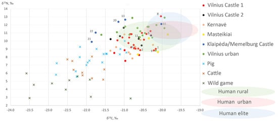 The analyzed dogs were sourced from a variety of places—cemeteries, large and small towns, and castles. The studied sites belonged to different cultural spaces, namely the Grand Duchy of Lithuania and the Teutonic Order. This made it possible to assess whether the nutrition of dogs found in diverse geographical, social, and cultural environments differed. The sampled canines represented two time periods, namely medieval and early modern, enabling the assessment and evaluation of canines’ diets across 600 years. A large number of individuals (MNI 34) from a single site, Vilnius Lower Castle, made it possible to test if the diet of elite dogs of different sizes differed. We also compared the results of the dogs’ stable isotope analysis with those of humans of different social strata, as well as with the stable isotope data of omnivorous pigs.