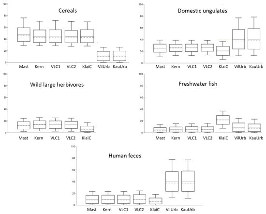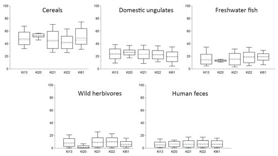 According to the FRUITS mixing model, cereals, a possible food source of dogs, vary from 11 ± 7% (urban Vilnius and Kaunas) to 47 ± 12% (Masteikiai). This food source makes the highest contribution in five out of seven dog groups from selected sites. In general, cereals’ contribution was similar in all sites, except in early modern urban contexts (Figure 11 and Table S2). Estimated domestic ungulate (cattle and pig) contributions vary from 22 ± 8% in Klaipėda/Memelburg castle to 40 ± 16% (urban, Vilnius); however, in all medieval inland sites and early modern period Vilnius Lower Castle, the average distribution was almost the same, being 26 ± 6%. The estimated terrestrial game animal contribution was also similar across all sites, varying from 13 to 14 ± 6%. However, wild game was not included in modeling the urban dogs’ diet, as wild game in general is absent from urban zooarchaeological material. The hunting was the privilege of elites in the early modern period; therefore, the town dwellers generally did not hunt [,,]. Freshwater fish intake was also similar in all inland non-urban sites, ranging around 5–6 ± 4%. It was slightly higher for urban dogs (8–9 ± 6–7%). Freshwater fish was more important in coastal site Klaipėda, consisting of 19 ± 8%. The lowest fecal consumption was in Klaipėda/Memelburg Castle (7 ± 5%), and was slightly higher in inland castles and other medieval sites. Meanwhile, in both early modern period urban contexts of Vilnius and Kaunas, feces consumption was almost the same (40 ± 17%) (Figure 11 and Table S2).