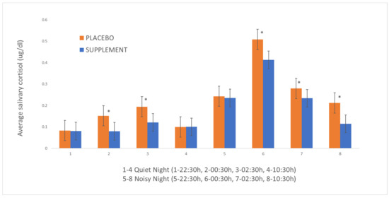 Mean salivary cortisol concentrations (µg/dL) collected from the dogs from the groups “supplement” and “placebo” throughout a “quiet night” (1–4) and a “noisy night” (5–8) for a study on the effects of a psychoactive supplement to mitigate the fear of fireworks. Asterisks indicate statistical differences between groups (“supplement” versus “placebo”).