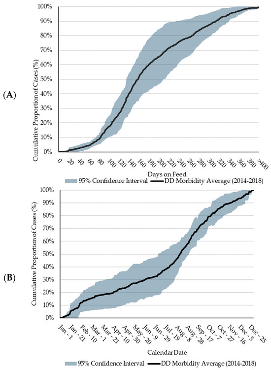 Five-year average (2014 to 2018) of the cumulative proportional distribution of digital dermatitis (DD) cases. Shading represents the 95% confidence interval (CI). (A): Distribution by days on feed (DOFs). (B): Distribution by calendar date.