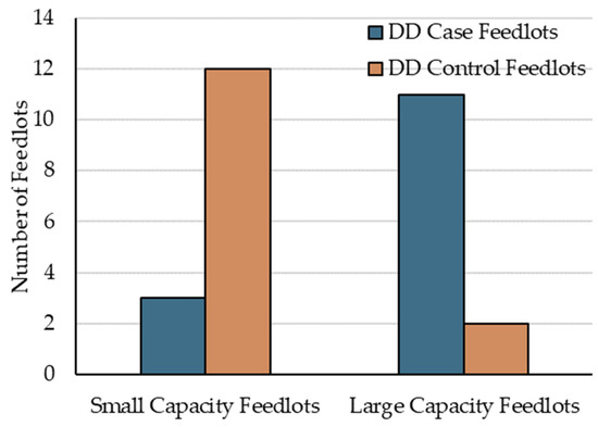 At the feedlot-level, the only significant finding was that SCF were at lower risk of having diagnosed DD cases than LCF (IRR = 0.24, 95% CI 0.05 to 0.76, p = 0.027). Interestingly, in addition to the current research coinciding with Woolums’ [23] report of higher AIP risk in females, at the feedlot-level, AIP was also more likely (p < 0.01) to occur in larger (≥10,000 cattle placed annually) versus smaller feedlots (<10,000 cattle placed annually) [29,36]. Figure 2 illustrates the distribution of population size within case and control feedlots.