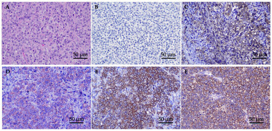 Immunohistochemistry was performed on all 27 tumors, and the results are summarized in Table 2. Based on the results, all tumors showed a negative T-cell marker and a positive B-cell marker. Eighteen cats (66.67%) showed low CD20 expression ((+), n = 5, 18.52%; (++), n = 13, 48.15%), while nine cats (33.33%) showed high CD20 expression ((+++), n = 8, 29.63%; (++++), n = 1, 3.70%) (Figure 1B–F). The median values of the positive ratios of the CD20 expression levels were as follows: low CD20 expression was 40.15% (range, 26.44–73.42%), while high CD20 expression was 83.44% (range, 75.68–90.74%). In the cats with low CD20 expression, the tumor staging was as follows: nine cats (50.00%) were classified as stage T1, two cats (11.011%) as stage T2, six cats (33.33%) as stage T3, and one cat (5.56%) was not staged. Meanwhile, among the cats with high CD20 expression, the tumor staging was as follows: three cats (33.33%) were classified as stage T1, two cats (22.22%) as stage T2, three cats (33.33%) as stage T3, and one cat (11.11%) as stage T4.