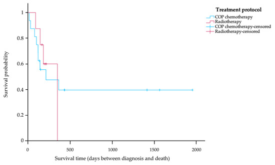 Of the 27 cats in the study, 24 cats (88.89%) received treatment after their diagnosis. Of the cats in the treatment group, 5 cats (20.83%) are still alive, 13 cats (54.17%) died during treatment, and 6 cats (25.00%) have an unknown survival time. Among the cats receiving treatment, the 16 cats (66.67%) with COP chemotherapy were divided into the following tumor stages: eight cats (50.00%) were classified as stage T1, three cats (18.75%) as stage T2, and five cats (31.25%) as stage T3. The other eight cats (33.33%) that received radiotherapy were divided into the following tumor stages: four cats (50.00%) were classified as stage T1, one cat (12.50%) as T2, and three cats (37.50%) as stage T3. The Kaplan–Meier survival curve in Figure 2 shows that the MST of the 16 cats receiving COP chemotherapy was 214 days (range 14–1955 days). Eight cats were treated with radiotherapy, and their MST was 350 days (range 91–350 days). No statistically significant difference in MST was observed between cats receiving COP chemotherapy and those treated with radiotherapy (p = 0.50).