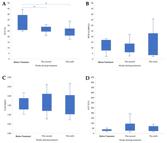 Clinicopathological characteristics and adverse events of treatment in cats with nasal lymphoma; (A) pack cell volume (PCV), (B) white blood cell, (C) creatinine (Creat), and (D) alanine aminotransferase (ALT) concentration. The values are shown as data plot and mean (* p < 0.05).