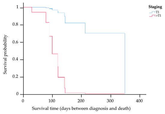 Kaplan–Meier survival curve showing the MST for cats with nasal lymphoma in stage T1 and other staging categories, where the blue line indicates cats with stage T1, and the red line indicates cats with the other staging categories (>T1). There was a significant difference in the MST between the two groups (p = 0.04).