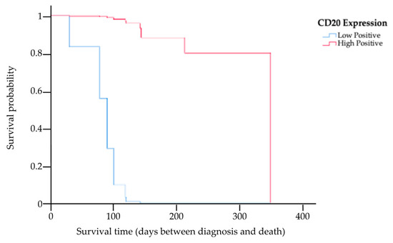 Kaplan–Meier survival curve showing the MST for cats with low and high expression of CD20, where the blue line indicates cats with low CD20 expression, and the red line indicates cats with high CD20 expression. There was a significant difference in the MST between the two groups (p = 0.01).