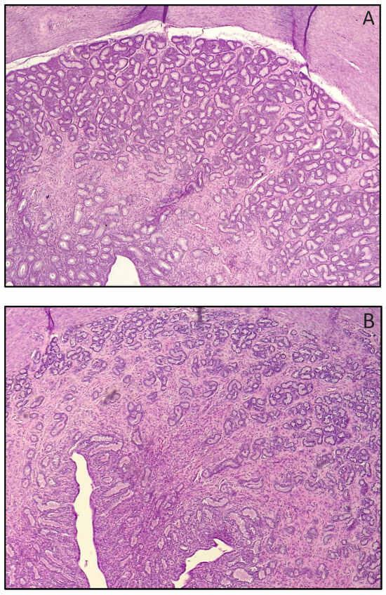 Endometrial area occupied by uterine glands in testosterone (A) and control (B) treated bitches in Table 1 (H&E, 10×). Notice the higher thickness and density in (A) (p < 0.01).