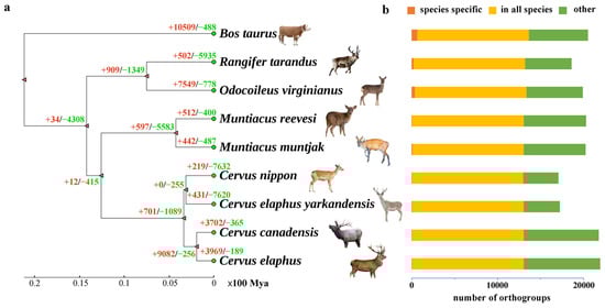 Phylogeny and gene family analysis of Cervidae. (a) Phylogeny with divergence time and gene family expansion and contraction in the eight Cervidae species, with Bos taurus used as an outgroup. The numbers of expanded (red) and contracted (green) gene families are shown on branches. (b) Horizontal bar plots indicate the number of orthogroups that are species-specific (red), present in all nine species (orange), or present in more than one but less than all species (green) in the analysis.