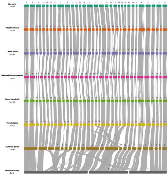The chromosome collinearity of seven species of Cervidae (Cervus elaphus yarkandensis, Cervus nippon, Cervus elaphus, Cervus canadensis, Rangifer tarandus, Muntiacus reevesi and Muntiacus muntjac), with Bos taurus as the reference. Odocoileus virginianus was excluded, as it is not a chromosome-level genome. The cirves are in the same colors, grey. The different colors are the chromosomes of different species.