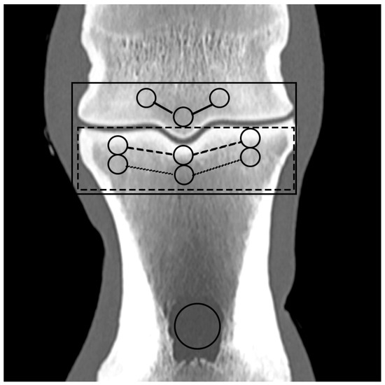 Regions of interest (ROIs; circles) and zones (mean EAN calculated from all ROIs included in an anatomical area; lines) in the dorsal aspect of a front fetlock joint on a mid-dorsal monoenergetic image (detector-based spectral computed tomography, Philips): ROIs in the medial and lateral metacarpal/metatarsal condyle (dorsal MC/MT zone; continuous line), the proximal subchondral and trabecular bone of the proximal phalanx (proximal P1 subchondral/trabecular zone; dashed/dotted line), the marrow cavity of P1, and the proximal epiphyseal P1 zone (dotted rectangular line) and dorsal FJ zone (continuous rectangular line).