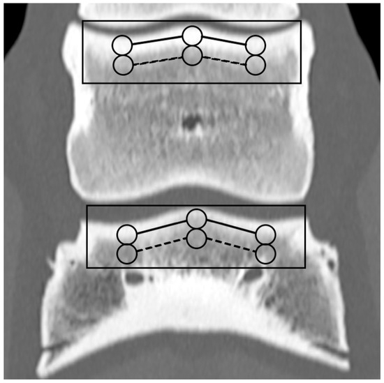 Based on the CT raw data, EAN and ED maps were created from both SSDECT and SBCT images (slice thickness 2 mm), and ROIs were drawn in the virtual monochromatic images (window level 500, window width 2500) using the proprietary software (Raw Data Analysis, CANON Medical and Intellispace Portal 12, Philips Healthcare). Mean EAN/ED values were recorded for each ROI. In total, 29 ROIs and 16 zones were defined for each distal limb. A zone referred to a certain anatomical area, and the mean EAN/ED was calculated from all ROIs included in this area. In the distal aspect of the third metacarpal (MC) and metatarsal (MT) bone, a mid-dorsal image was chosen, and one ROI each was placed in the subchondral bone of the sagittal ridge and the medial and lateral condyle, respectively (dorsal MC/MT zone) (Figure 1). Additionally, a transverse image was chosen at the level of the maximum width of the proximal sesamoid bones (PSB), i.e., at the transition from the distal to the mid-third of the PSBs, and 1 ROI each was placed in the palmar/plantar subchondral bone of the medial and lateral metacarpal/metatarsal condyle (plantar MC/MT zone) and the dorsal subchondral bone of the medial and lateral proximal sesamoid bone (PSB zone) (Figure 2). The mean of all palmar/plantar ROIs in the FJ area (plantar MC/MT and PSB ROIs) represented the palmar/plantar FJ zone (Figure 2). In the first (P1) and second (P2) phalanx, a mid-dorsal image was chosen at the level of the marrow cavity or nutrient foramen, respectively, and in the third phalanx (P3), a dorsal image was chosen parallel to the dorsal surface of the bone at the level of the solar canal. Three ROIs each (medial and lateral fovea, sagittal groove or extensor process) were drawn in the proximal subchondral bone (proximal P1/P2/P3 subchondral zone) and trabecular bone (proximal P1/P2/P3 trabecular zone) distal to the latter in all phalanges (Figure 1 and Figure 3). Larger zones were calculated including all ROIs in the proximal subchondral and trabecular bone of P1, P2 and P3, respectively (proximal epiphyseal P1/P2/P3 zone) (Figure 1 and Figure 3). Moreover, the mean of all dorsal ROIs in the FJ area (distal MC/MT, proximal P1) represented the dorsal FJ zone (Figure 1). A single ROI was also applied to the marrow cavity of P1 (Figure 1). On a mid-dorsal plane of the NB, 3 ROIs were evenly distributed medially, centrally, and laterally within the spongious bone (navicular zone) (Figure 4). All ROIs were of a circular shape with a diameter of 4 mm (smallest ROI possible for both CT units) except for the circular ROI in the marrow cavity of P1, the diameter of which was adapted to the size of the marrow cavity.
