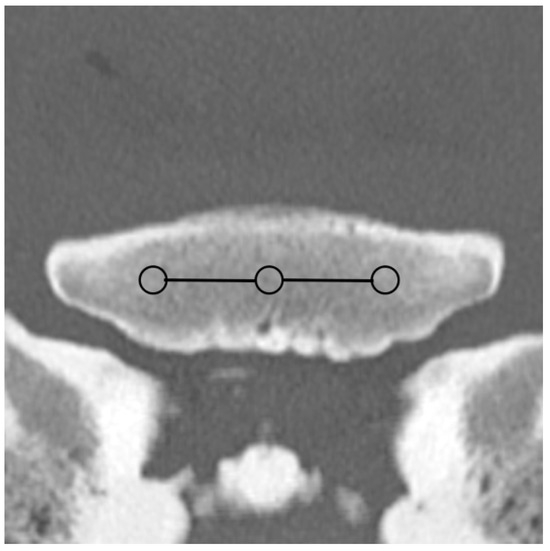 Medial, central, and lateral region of interest (ROI; circles) within the spongious bone of a front navicular bone on a mid-dorsal monoenergetic image (detector-based spectral computed tomography, Philips) and navicular zones (mean EAN calculated from all 3 ROIs; continuous line).