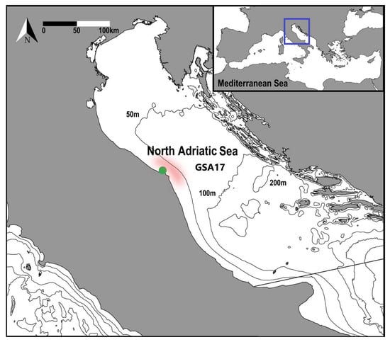 The northern Adriatic Sea (Figure 1) is known for its eutrophic shallow waters and expansive continental shelf, which boasts an average depth of 35 m, making it the broadest within the Mediterranean Sea. In contrast, the central part of the basin delves much deeper, plunging to depths of 270 m in the Jabuk/Pomoa Pit. The Adriatic Sea itself exhibits very distinct characteristics between its eastern and western sides. The eastern side is marked by greater depth and rocky terrain, while the western side is predominantly shallow, sandy, and heavily influenced by various river outlets that impact seawater circulation [29,30]. The circulation within the Adriatic follows a cyclonic pattern, governed by two primary currents: the eastern and the western. The eastern current moves in a northward direction along the eastern coastline, featuring three gyres. The northern gyre, affected by strong winds like the Bora and significant freshwater input, primarily from the Po River, generates the western current. This current flows southward along the Italian shores, carrying substantial amounts of nutrients [30]. The considerable nutrient influx from river discharges positions the GSA 17 as one of the most productive zones within the entire Mediterranean Sea [31]. Consequently, it stands as one of the most exploited European basins [32], owing to its high productivity [29,33]. The eutrophic nature of the northern Adriatic Sea supports a diverse array of marine life, ranging from phytoplankton to fish species, and contributes significantly to the regional economy through fisheries and tourism.