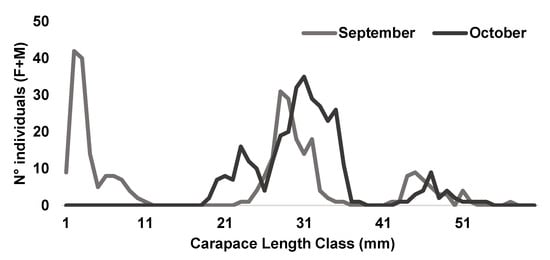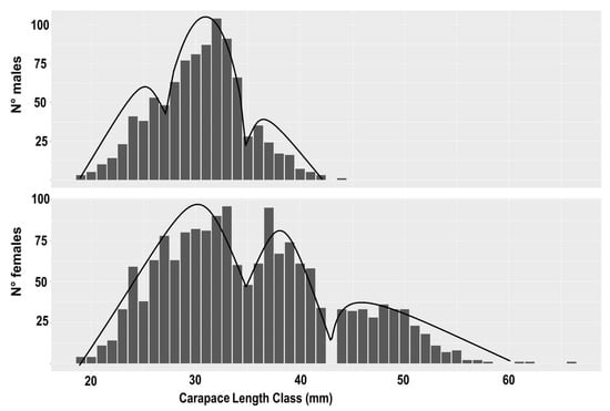 The LFDs of small specimens, unsorted by sex, obtained from the nearshore nursery ground, exhibited a CL range of 1 to 11 mm. These specimens were integrated into the analysis for both sexes, contributing to a comprehensive understanding of size distribution dynamics within the population. Notably, previous studies have identified that growth differences between sexes may emerge as early as the juvenile stages [19,46], underscoring the importance of considering sex-specific growth patterns in demographic analyses.