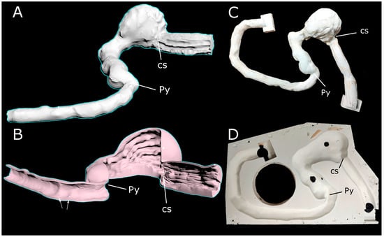 Digital images of the upper digestive tract during processing by 3DMax software. (A) Preliminary raw 3D model of the canine stomach obtained from the MRI images. The model is not hollow. (B) Sagittal section after merging the external wall and the inner mucosa in a whole 3D model; notice the gastric folds. (C) The positive mold of the lumen (with cubes in the ends) was obtained to generate the internal surface mucosa of the silicone model. The cubes permitted a better extraction of the silicone model and a better end resolution after cutting them. (D) One of the halves of the negative mold for the external surface wall, with four holes (black spots) to introduce the silicone. Duodenum papillae (arrows); Pylorus (Py); Cardiac sphincter (cs).