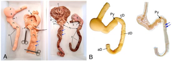Comparison of 3D-printed models and real organs as displayed to students during the anatomy sessions. (A) Whole and opened 3D models (left) and real organs (right). (B) Whole 3D-printed model (left) and one of the halves (right). The letters and arrows indicate the different anatomical items. Esophagus (E); cardiac sphincter (C); fundus (F); body of the stomach (B); pyloric region (Pr); pylorus (Py); angular incisure (I); duodenum (D): cranial (cD), descendent (dD), and ascendent (aD). Blue arrows point to the duodenum papillae.