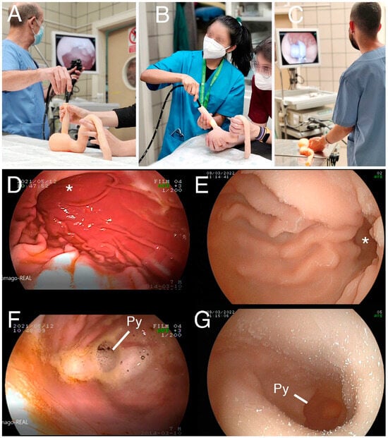 Upper endoscopy training with the 3D-printed models. (A) The teacher shows the students the manipulation of the endoscope. (B) Students trying the endoscope on the 3D-printed model. Observe how the light of the endoscope helps positioning. (C) Student practicing removal of a foreign body from the 3D stomach. (D–G) Screenshots of the endoscopic images obtained from the stomach, real (D,F) and 3D-printed (E,G). (D) Gastric folds of the real stomach. Angular incisure (*). (E) Gastric folds of the 3D-printed stomach. Angular incisure (*). (F) Pyloric region of the real stomach. Pyloric sphincter (Py). (G) Pyloric region of the 3D-printed stomach. Pyloric sphincter (Py).