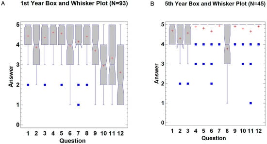 Box and whisker plots of answer values for each question for first-year students’ survey (A) and fifth-year students’ survey (B). The mean is represented by the red cross, while the median is the blue line that divides the grey bar. To facilitate the identification of the median, there are notches that indicate its location. The blue squares show the outlier results.