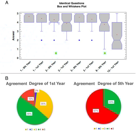 (A) Box and whisker plots of comparison of identical questions between both students’ surveys. The mean is represented by the red cross; the median is the blue line that divides the grey bar. To facilitate the identification of the median there are notches that indicate its location. The blue squares show the outliers. Green asterisks represent the significant differences between questions (p = 0.005 in question 2; p < 0.0001 in question 8 vs. 12). (B) Circular charts illustrating the percentage of degree of agreement among first-year and fifth-year students regarding the 3D model; 1—strongly disagree (orange), 2—disagree (blue), 3—neutral (yellow), 4—agree (green), 5—strongly agree (red).