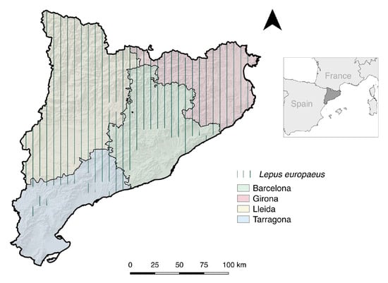 Map of the study area in Catalonia, NE Spain, indicating provinces sampled (Barcelona, Girona, Lleida, and Tarragona), and the distribution of the European hare (Lepus europaeus). The European rabbit (Oryctolagus cuniculus) is widely distributed throughout the territory in all provinces within Catalonia.