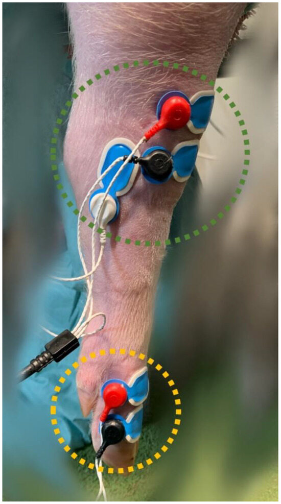 Stimulation (yellow circle) and recording (green circle) surface electrodes, placed on the right hindlimb at the level of the common dorsal digital nerve and the tibialis cranialis muscle, respectively.
