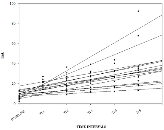 The median and interquartile ranges of the NWRt values for each TI are reported in Table 1. Their graphical representation and the relative increase compared to the baseline, together with representative NWR recordings and graphical representations of the NWRt for each pig, TI and day, are reported in Supplementary Materials (Files S1–S3).