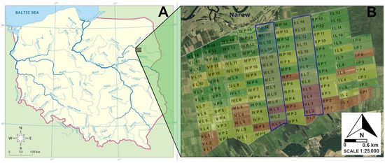 The study area (Figure 1) is located in north-eastern Poland, in the valley of the Narew River, between the villages of Grądy-Woniecko, Bronowo, Kalinówka-Basie, and Lutostań (endpoints of the study area: EPSG 2180: 1. N: 53°08′23.40″, E: 22°22′54.85″; 2. N: 53°07′15.90″, E: 22°23′41.30″; 3. N: 53°07′42.35″, E: 22°19′02.33″; and 4. N: 53°06′14.14″, E: 22°19′27.93″). The study area had 13.2 km2 and was located on humid grasslands in agricultural use.
