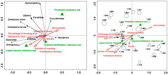 Relationships between arthropod abundance, arthropod diversity, and the ratio of large arthropods in samples and variation in environmental factors were examined using canonical simultaneous analysis based on three data matrices: the first consisted of the abundance of arthropods in Barber pitfall trap samples collected in individual meadows, the second consisted of the share of arthropods larger than 1 cm in the taxa sample, and the third consisted of environmental variables: distance to the forest boundary (m), distance to the river (m), the length of the meadow boundary line with shrubs and tree stands (m), soil moisture (ranks: 1–3), number of times mown (ranks: 0–4), percentage of mowing area (%), type of meadows use (protected meadows; intensive use, chemical fertilisation; and intensive use, liquid manure fertilisation), and intensity of fertilisation (ranks: 1. lack, 2. moderate fertilisation, 3. excessive fertilisation, and 4. intensive fertilisation). The relationship was analysed using constrained ordination and redundancy analysis—RDA [158]—with Canoco 5 software. The significance of the relation with explanatory variables and the effect of the whole constrained axis were tested using the Monte Carlo permutation test (number of permutations = 99,999). The contribution of individual environmental variables to the explanation of variance in the dependent variables was also tested using the same Monte Carlo permutation test, and probabilities of error of the first type were given for each variable, along with the correction as a result of testing the null hypothesis during multiple comparisons. Corrections were made using the false discovery rate method, a procedure designed to control for the expected proportion of “discoveries” (rejected null hypotheses) that are false. FDR-controlling procedures provide high testing power [159,160].