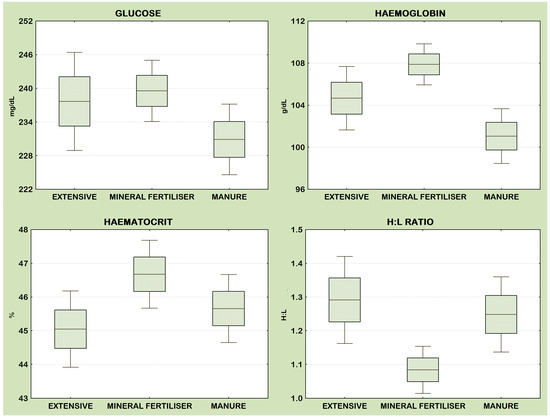 Other authors point to glucose and haematocrit as indicators of environmental stress related to both nutrition and pollution. Glucose concentrations may also indicate malnutrition in birds [126]. Haematocrit is one of the more commonly used haematological indices, since, as indicated by a study conducted on the blue tits Cyanistes caeruleus, haematocrit is influenced primarily by environmental conditions rather than genetic or maternal factors [127]. On the other hand, Kamiński et al., in studies conducted on white storks, observed the effect of heavy metal element interactions in a polluted environment on Hb (haemoglobin) content and values of red blood [128] and concluded that the use of only Hct (haematocrit) and Hb to assess the health and condition of birds is questionable and gives a positive correlation with various environmental stresses [129].