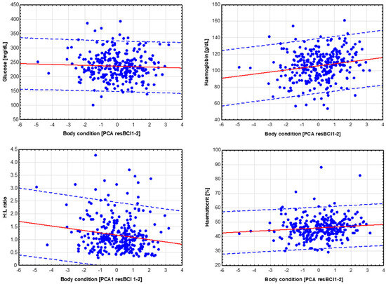 Relationship between body condition and haematological parameters of red-backed shrike chicks; striped lines—95% predicted.