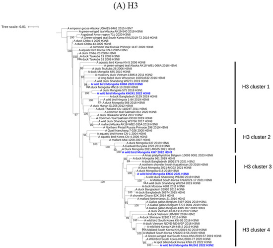 Phylogenetic analysis of the surface genes of isolated Mongolian AIVs was performed to assess their genetic relationships with other AIVs, including those in Korea (Figure 2). It was discovered that active surveillance in Mongolia had found four clusters of H3 (Figure 2A), two clusters of H4 (Figure 2B) and three clusters each of N8 (Figure 2C) and N6 (Figure 2D) genes through phylogenetic analysis. The HA and NA genes of H3N8 and H4N6 viruses isolated from this study were found to align with the Eurasian lineage, as evidenced by representative clustering. H3 and H4 AIVs were previously shown to be the predominant HA subtypes found in the viruses circulating among wild birds in Mongolia [17,18]. In addition, several of these viruses exhibited a close relationship with H3Nx and H4Nx viruses isolated from Korean wild birds during 2017 to 2022 (Figure 2). AIV isolates from Mongolia were found to be closely related to AIV isolates from wild birds in Korea, suggesting that these viruses had been carried by migratory birds between the two countries over 10 years [17]. Intriguingly, among our isolates, A/wild bird/Mongolia/ER30/2021/H3N8 (EPI_ISL_18968158) displayed a low nucleotide identity, below 91.3%, with previously reported N8 genes in GISAID. However, the H3 gene of this virus showed a notably higher nucleotide similarity, exceeding 99.7%, with the H3N8 virus (A/duck/Mongolia/618/2018; EPI_ISL_368635) from 2018. These rare N8 genes may suggest the presence of a minor viral subpopulation infecting wild birds that continues to spread unnoticed.