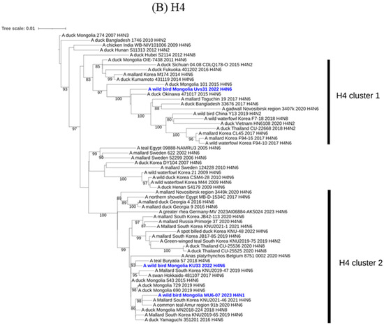 Maximum-likelihood phylogenetic tree for the hemagglutinin (HA) and neuraminidase (NA) genes. Bootstrap values (1000 replicates) > 70% are displayed at the branch nodes. The Mongolian viruses isolated in this study are highlighted in blue. The scale bar indicates the number of nucleotide substitutions per site. (A) Phylogenetic tree for H3 genes. (B) Phylogenetic tree for H4 genes. (C) Phylogenetic tree for N6 genes. (D) Phylogenetic tree for N8 genes.