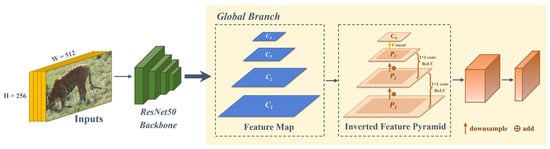 - In order to better extract and integrate the global information of the high-level and low-level layers of the Amur tiger, we propose a multi-scale feature fusion method of the global inverted pyramid. We introduce the ideas of Feature Pyramid Network (FPN) [] and PANet into the global branch of the model for the task of wildlife re-ID. Improving the top-down connection method of traditional feature pyramid models will greatly compress the problem of key deep semantic information [].